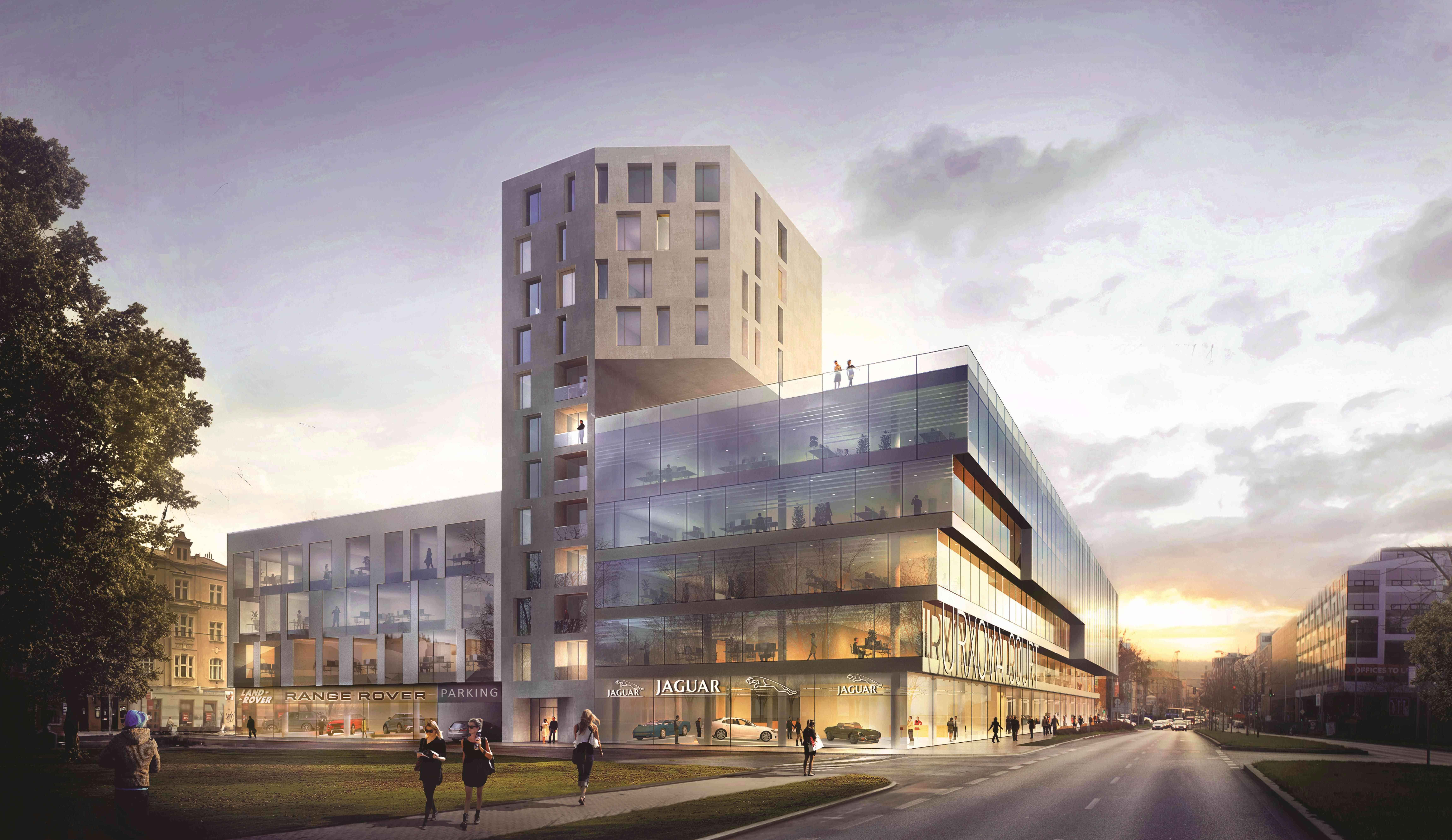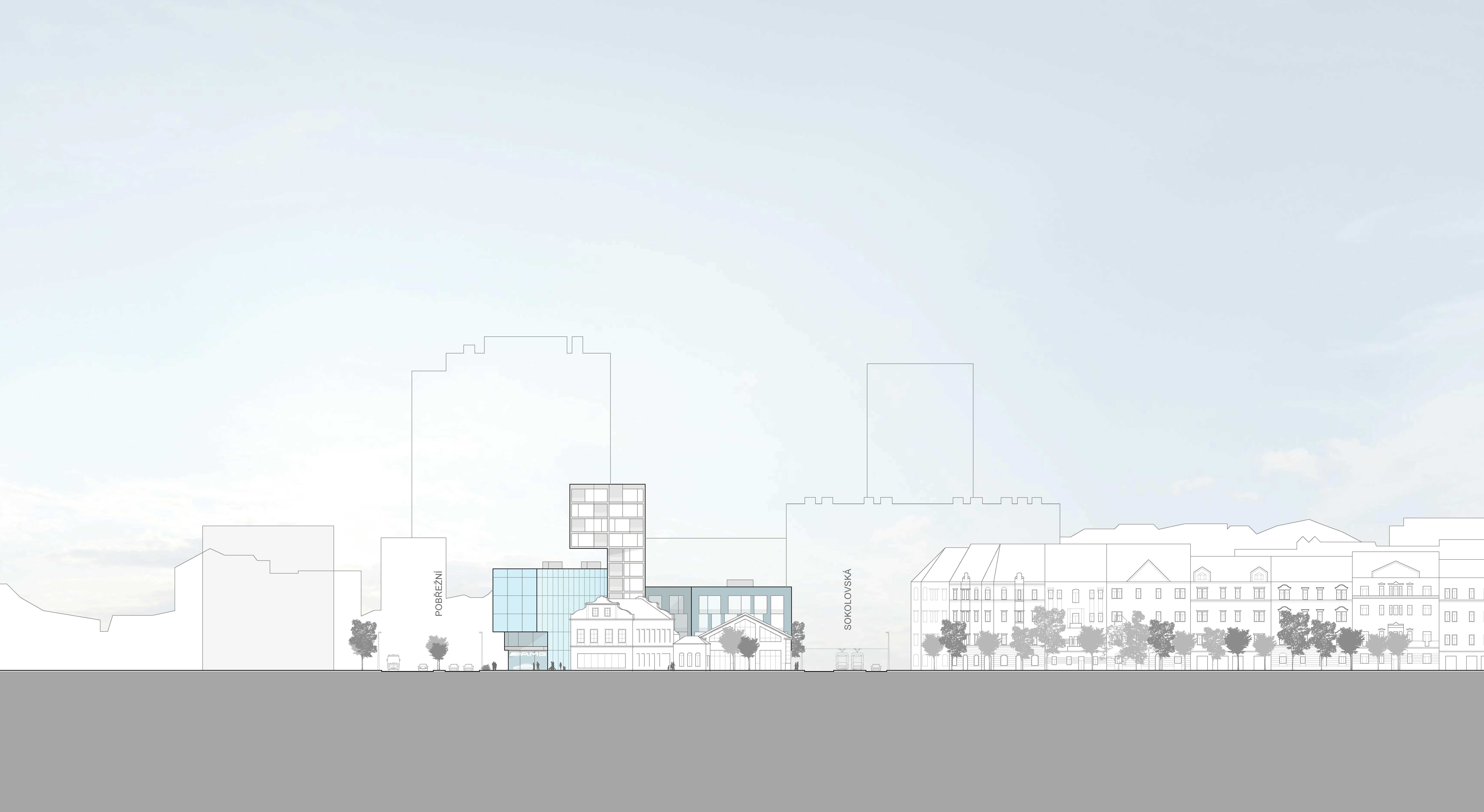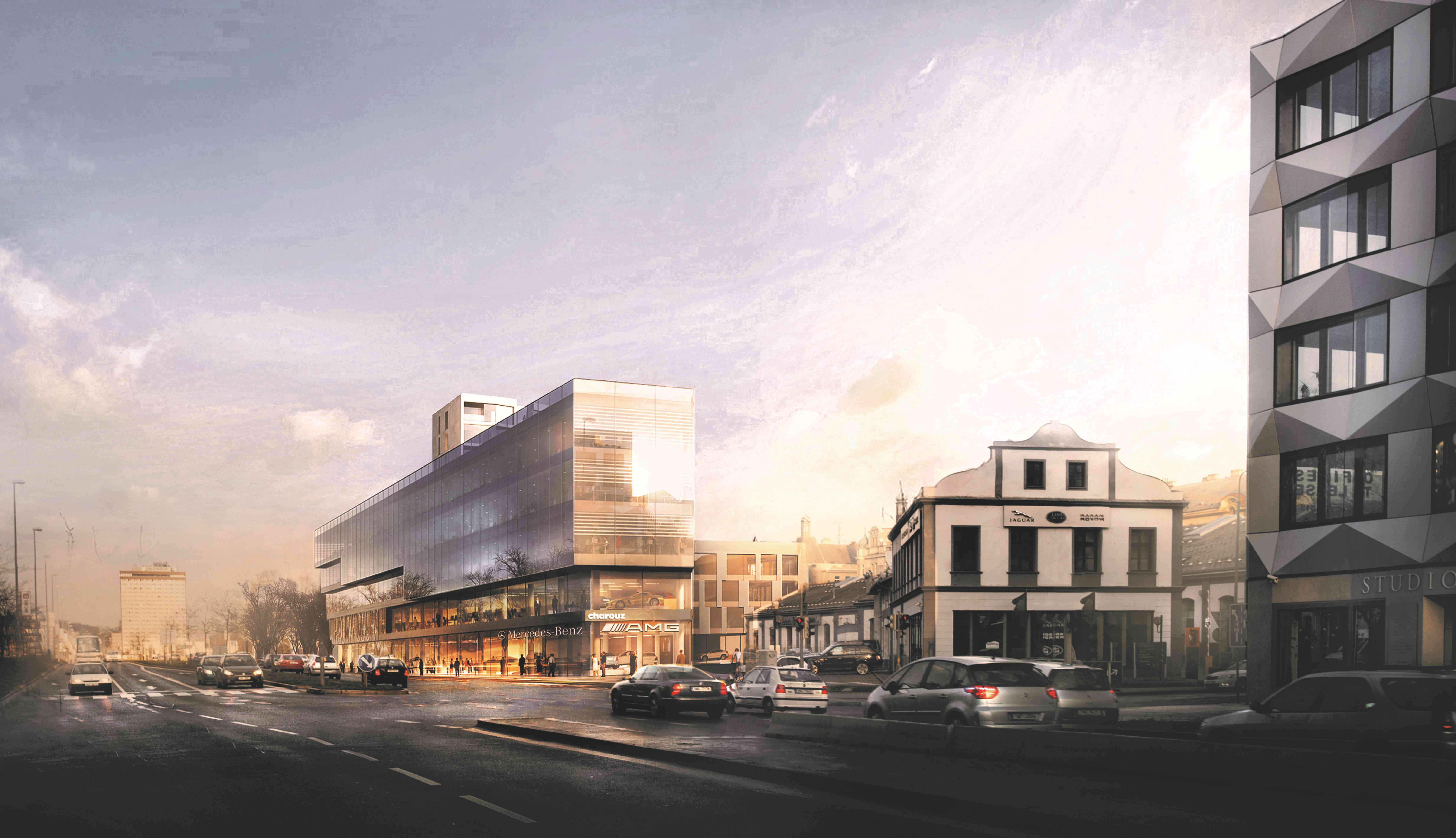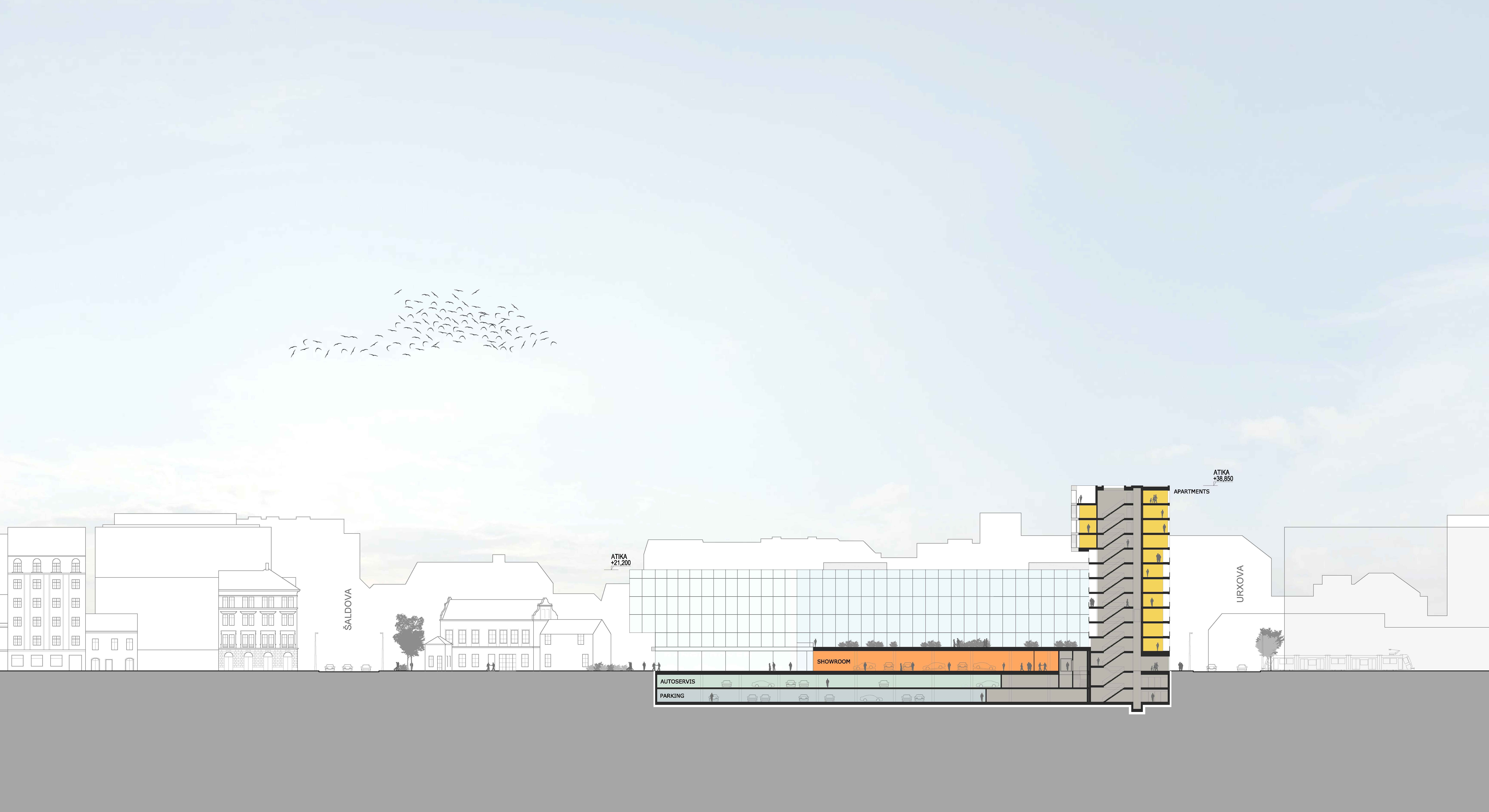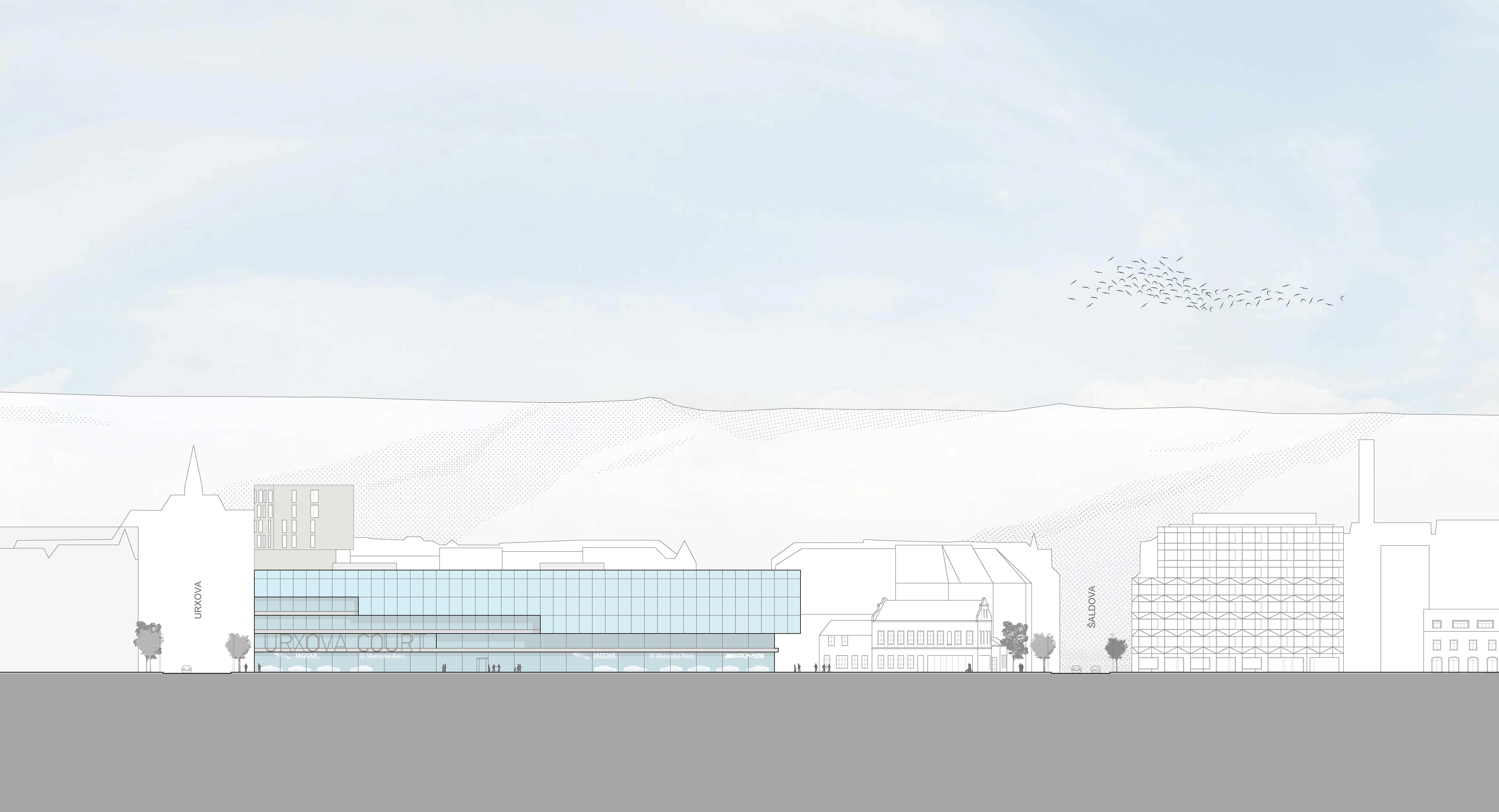 Zadání pro naši práci představuje celkové dokončení městského bloku, který ale v západní části pozemku nelze uzavřít zcela. Historické, památkově chráněné objekty navždy ponechají jedno čelo bloku otevřené, nedokončené. Tato skutečnost neznamená sama o sobě žádnou sníženou kvalitu budoucího celku. Pro Prahu je charakteristické nestejné měřítko a výška objektů a pro nás bylo zvládnutí této danosti PRVNÍ PRINCIPIELNÍ VĚCÍ při tvorbě konceptu – nové objekty řádově většího měřítka než původní historické stavby by s nimi měly tvořit harmonický celek a zprostředkovat ve svém objemu i zobrazení měřítka těchto staveb. Současně by měla mít architektonická forma objektu do Rohanského nábřeží určitý kompoziční přesah směrem k otevřené části bloku, aby byl alespoň symbolicky, a uliční čára Rohanského nábřeží nepůsobila nedokončeně. Toho se snažíme dosáhnout metodou konického zúžení čela objektu a jeho překonzolováním v západní části hmoty a dále horizontálním členěním severní fasády, která překonává v náznaku neukončitelnou mezeru až k administrativnímu objektu Keystone. Tato forma dynamického členění fasády je současně symbolem prémiových značek automobilů, kterým je věnován celý rozsáhlý parter budovy, vystihuje jejich dynamiku a eleganci.