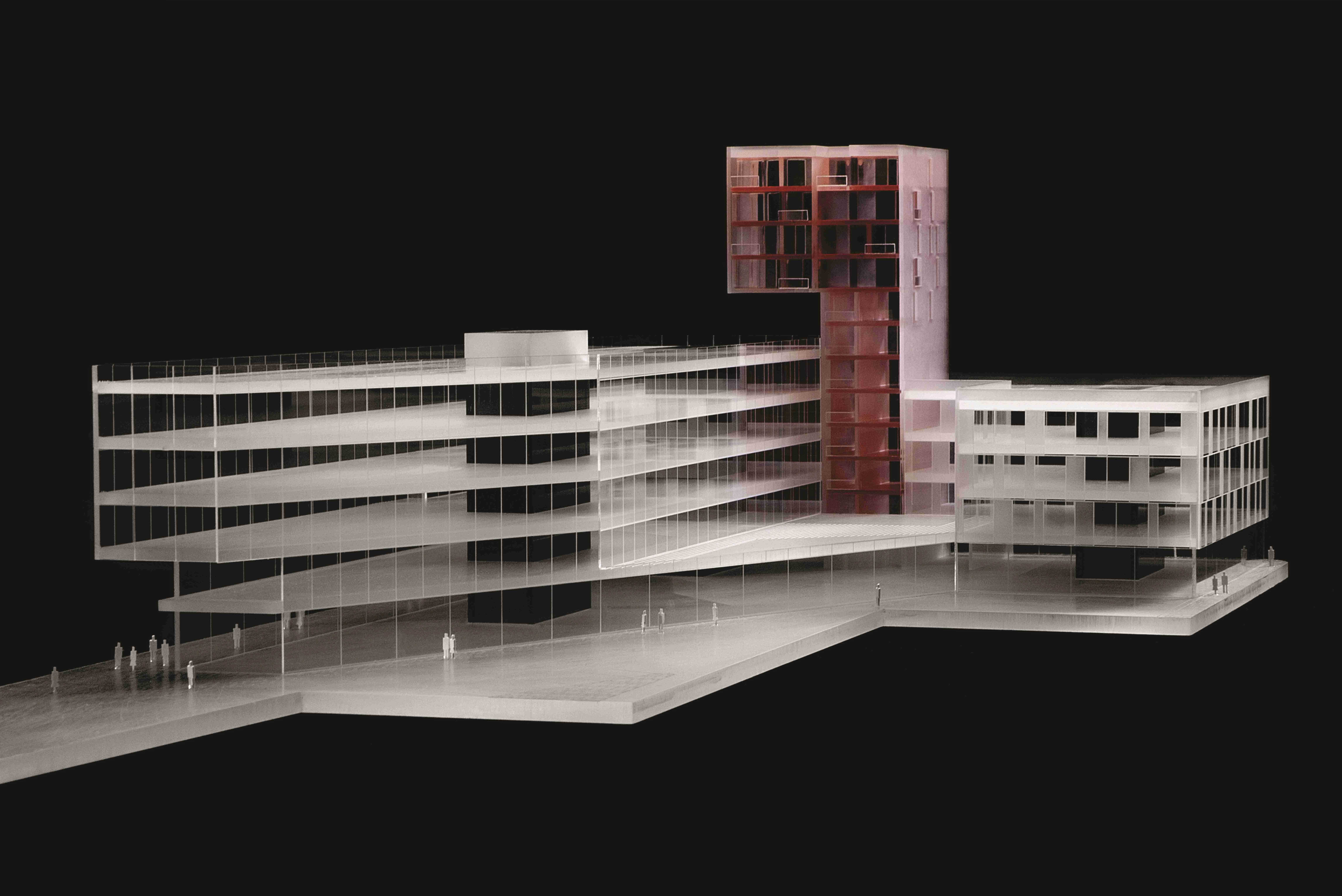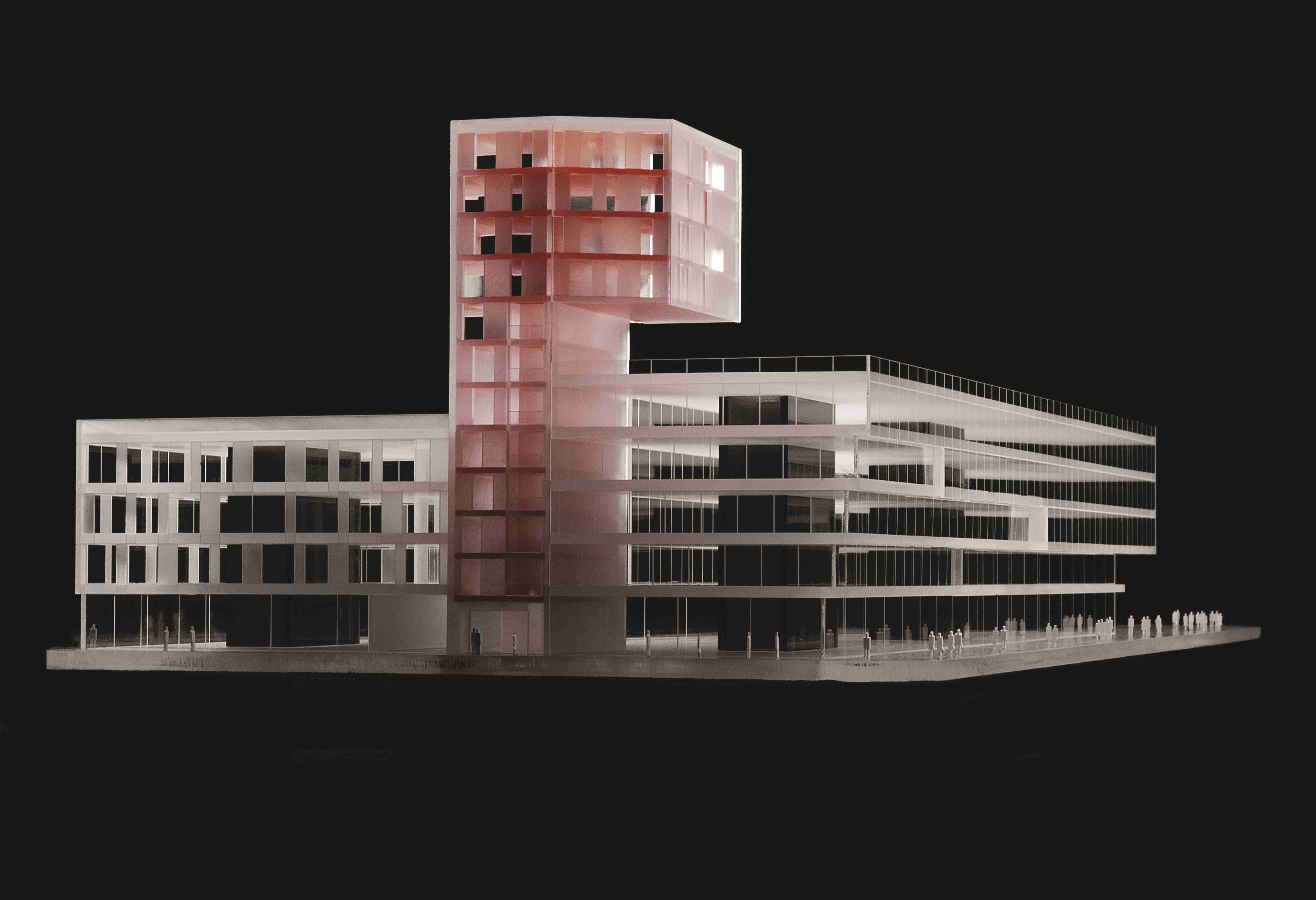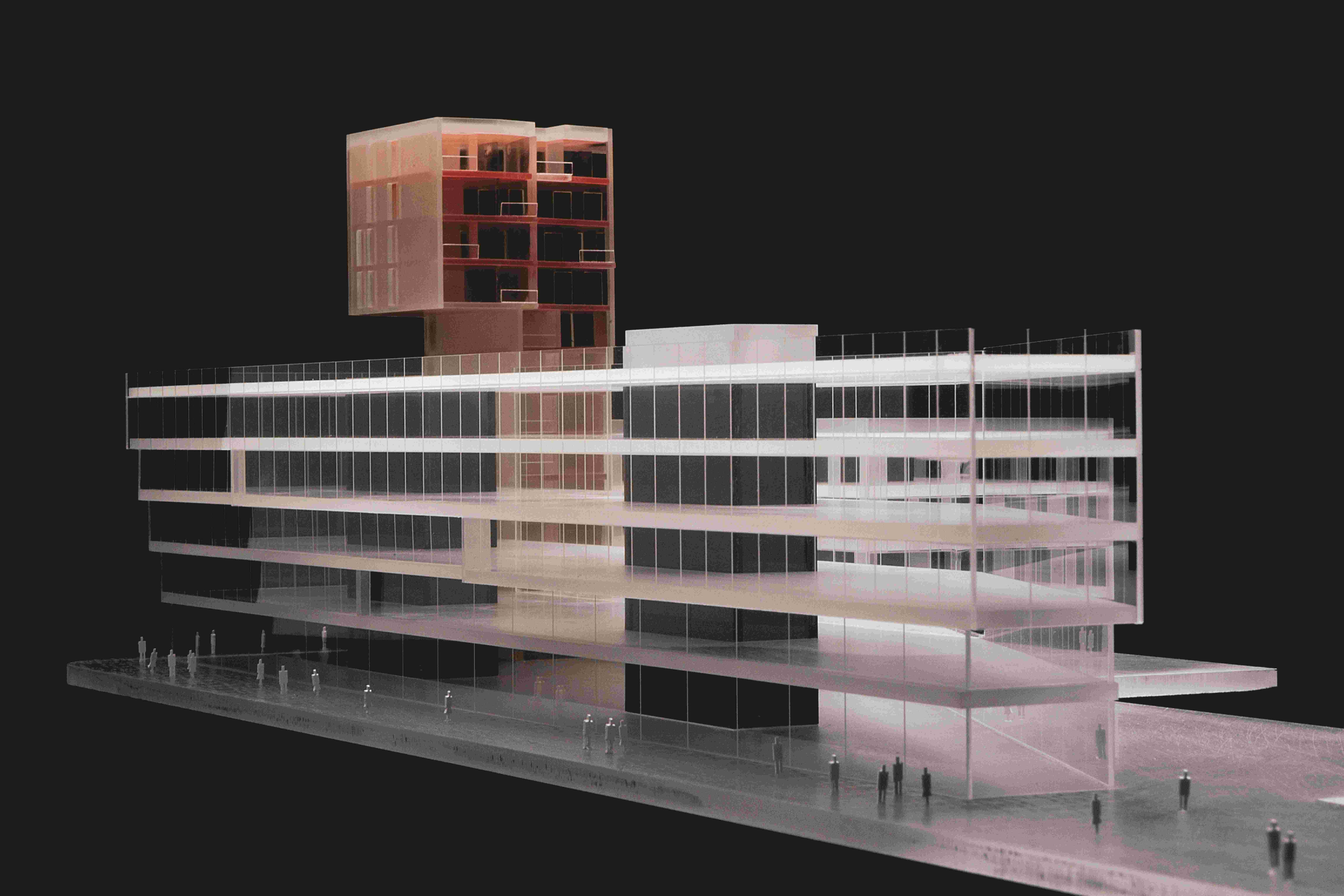 DRUHOU PRINCIPIELNÍ VĚCÍ konceptu je řešení bytového objektu v rámci celého bloku, který má být převážně administrativní. Umístění bytového domu je z mnoha důvodů potřebné – od žádoucí diverzity funkcí, přes zprostředkování vhodného členění jednotlivých objektů podle prostředí ulic až po proporční podmínky funkcí Územního plánu. Spornou stránkou malého bytového objektu v rámci administrativního areálu a retailového dvora je jeho „ztracenost“ v nerezidenčním prostředí a obecně menší atraktivita bytů v nižších podlažích, pokud by měly být nabízeny jako byty luxusní. Na základě předchozích úvah jsme navrhli menší, ale výrazný dům v podobě jakéhosi periskopu, který dokáže pro podstatnou část bytů (těch větších) zajistit jedinečný výhled přes karlínské střechy na panorama Pražského hradu. Užší část domu v uliční frontě obsahuje kromě výtahu a schodiště ještě malé byty, u kterých lze nároky na atraktivní výhled částečně postrádat a jejich celková výměra oproti bytům nad rovinou karlínských střech je optimalizovaná. Čerpání koeficientu podlažních ploch pro méně atraktivní a ekonomicky slabší část investice – byty v nižších podlažích, je tak jediným možným způsobem minimalizována v situaci, kdy umístění bytů ve vyšších podlažích přímo nad kancelářemi je v komerčním developmentu zásadně komplikované.